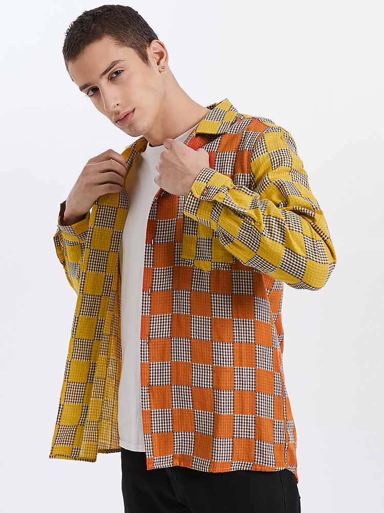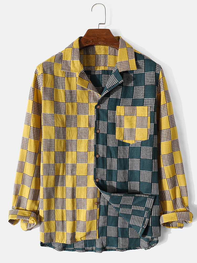 Mens Gingham Check Patchwork 100% Cotton Long Sleeve Shirts – Green S