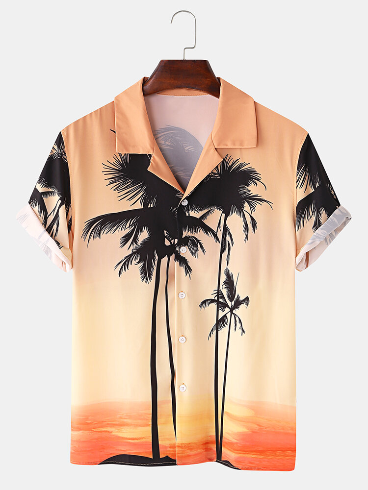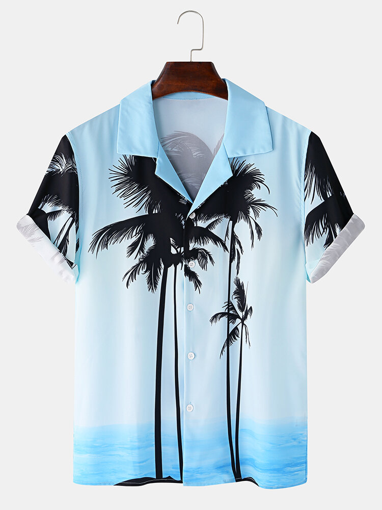 Mens Gradient Beach Landscape Print Revere Collar Hawaii Holiday Short Sleeve Shirts – Blue 2XL