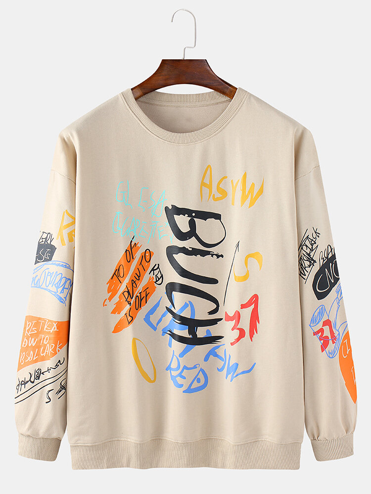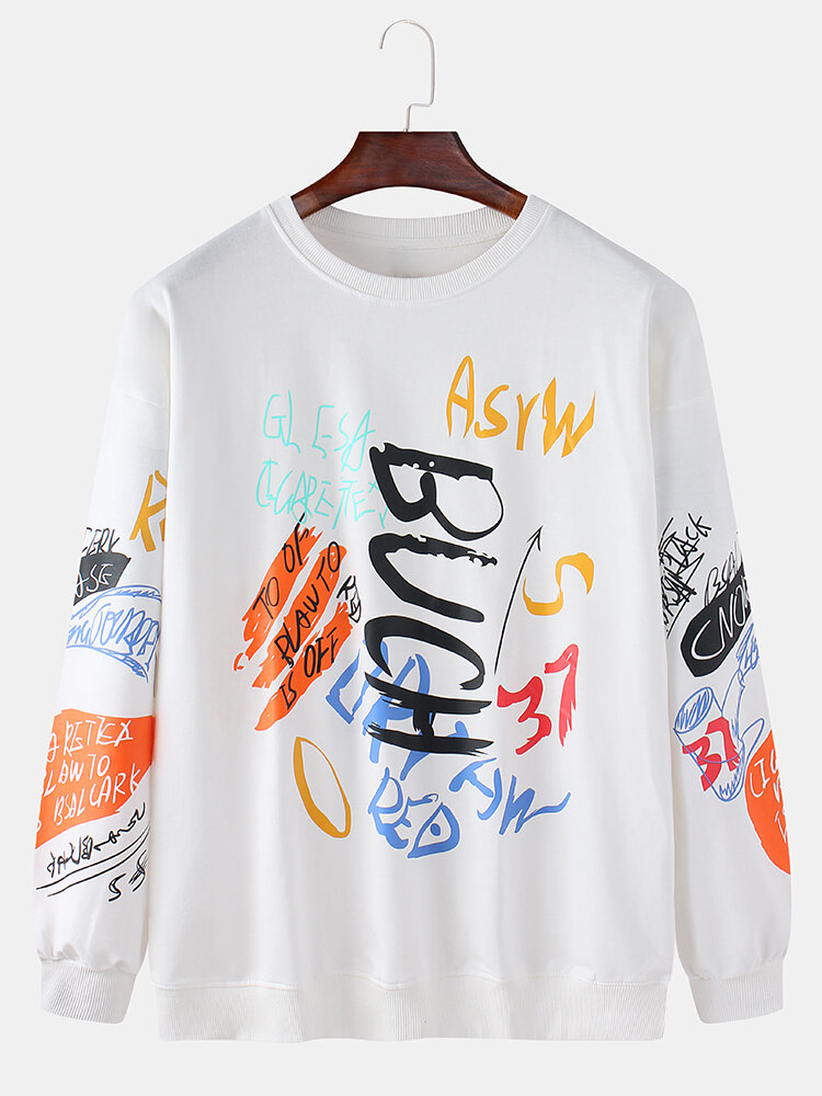 Mens Graffiti Print Long Sleeve Pullover Cotton Casual Sweatshirts – White XL