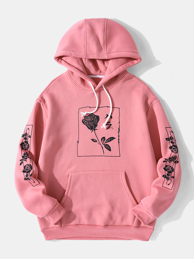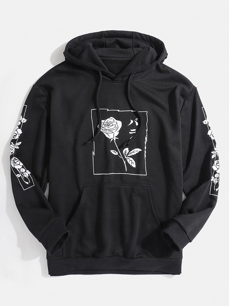 Mens Graphic Rose Print Relaxed Fit Drawstring Hoodies – Black S