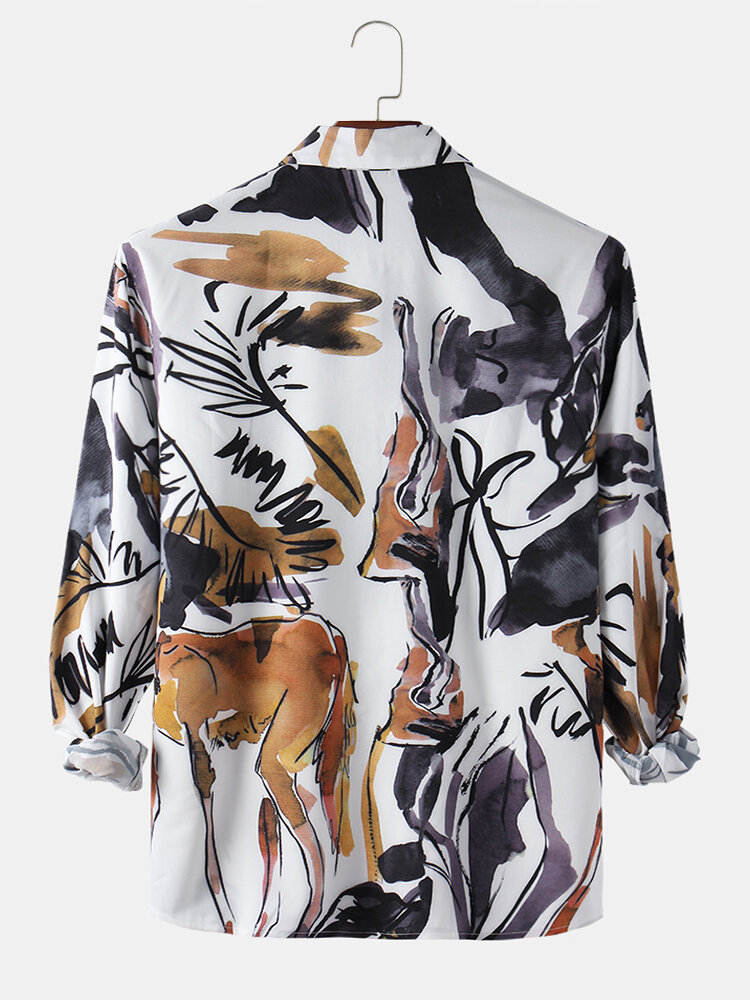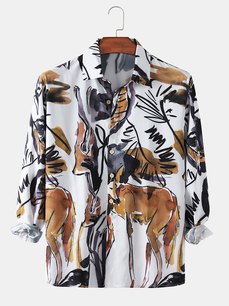 Mens Hand-Painted Abstract Animal Print Light Long Sleeve Shirts – White XL