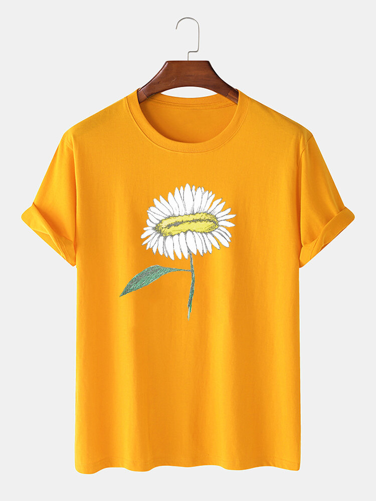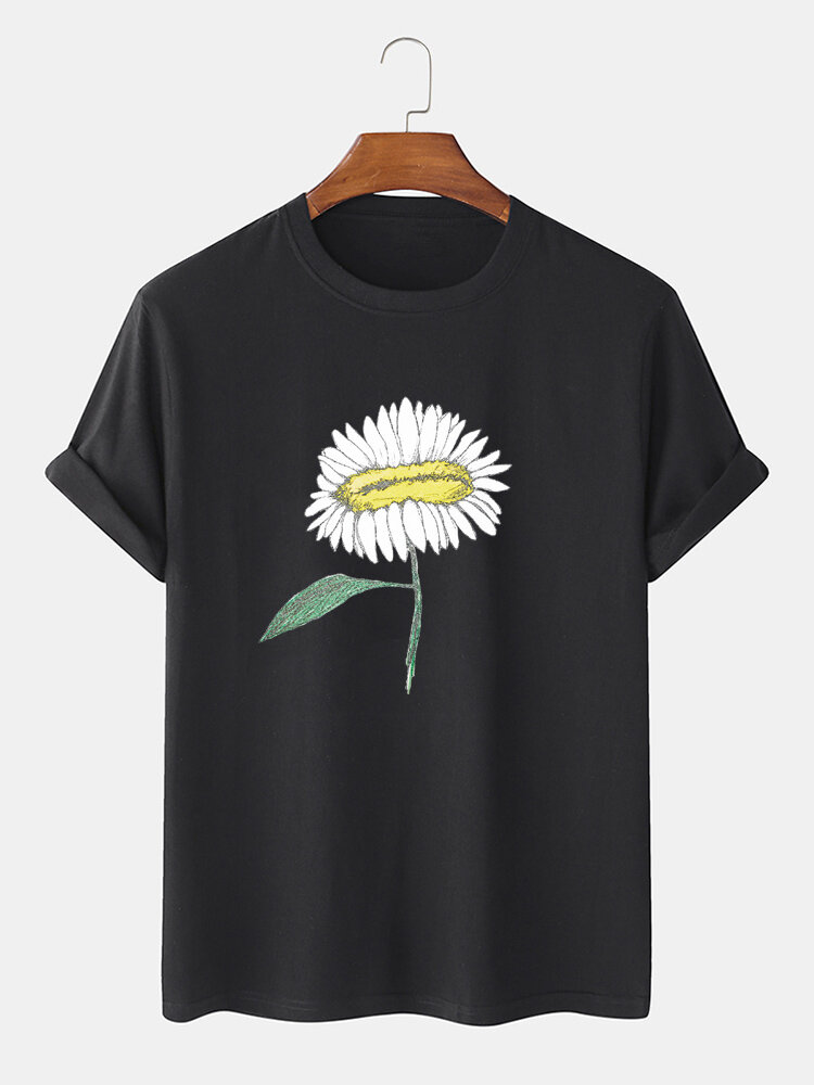 Mens Hand-Painted Flower Print 100% Cotton O-Neck Short Sleeve T-Shirt – Black S
