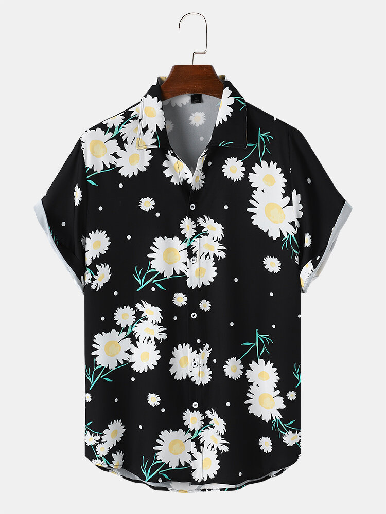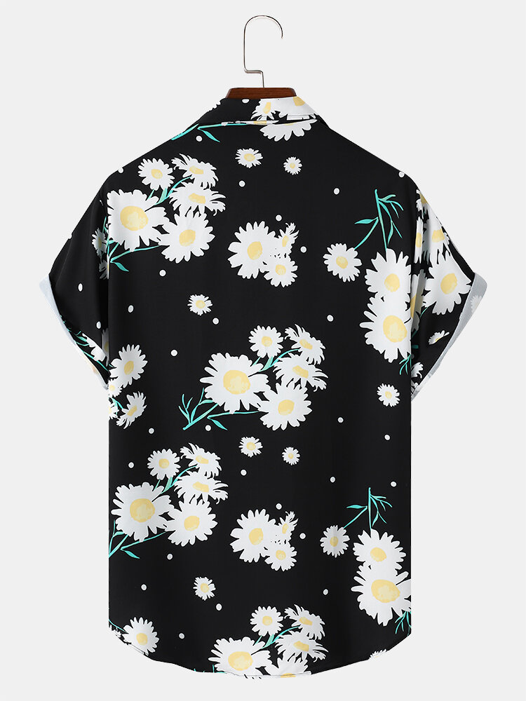 Mens Holiday Daisy Floral Print Button Up Short Sleeve Black Shirts – Black L