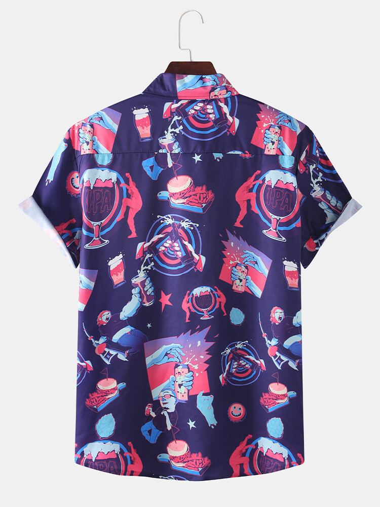 Mens Holiday Funny Cartoon Happy Party Breathable Short Sleeve Shirts – Black S