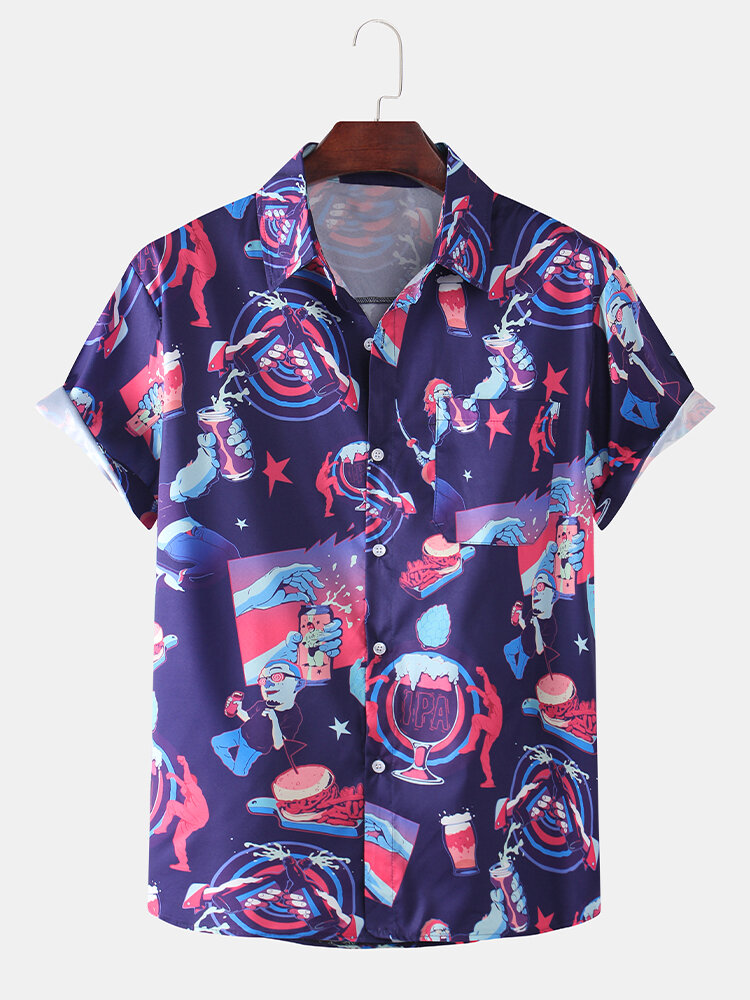 Description:Item Type: ShirtsPattern Type: PrintingGender: MenFit Type: FitStyle: Casual,FashionThickness: RegularCollar: Turn Down CollarSeason: SummerDecorations: Funny PatternMaterial: 100% PolyesterSleeve Length: Short SleeveColor: BlackCuff Type: Shirt SleeveOccasion: Leisure,Home,Daylife,Holiday