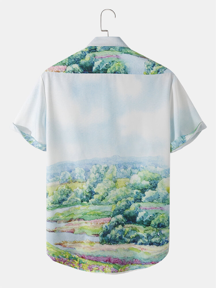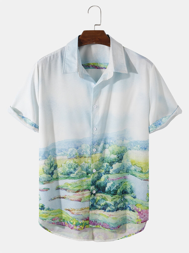 Mens Holiday Landscape Print Short Sleeve Casual Shirts – Sky Blue S