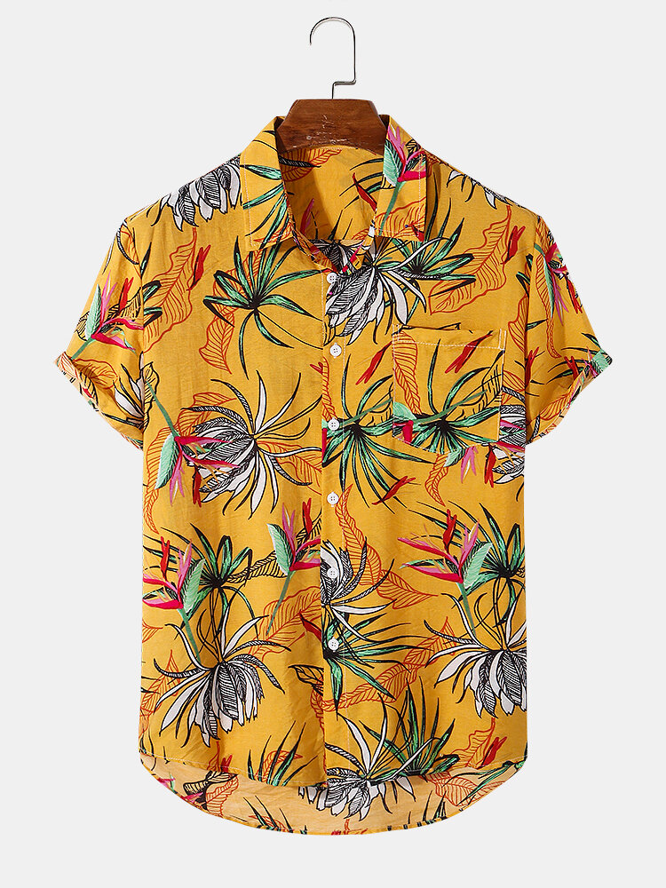 Mens Holiday Leave Print Short Sleeve Casual Shirts – Yellow S