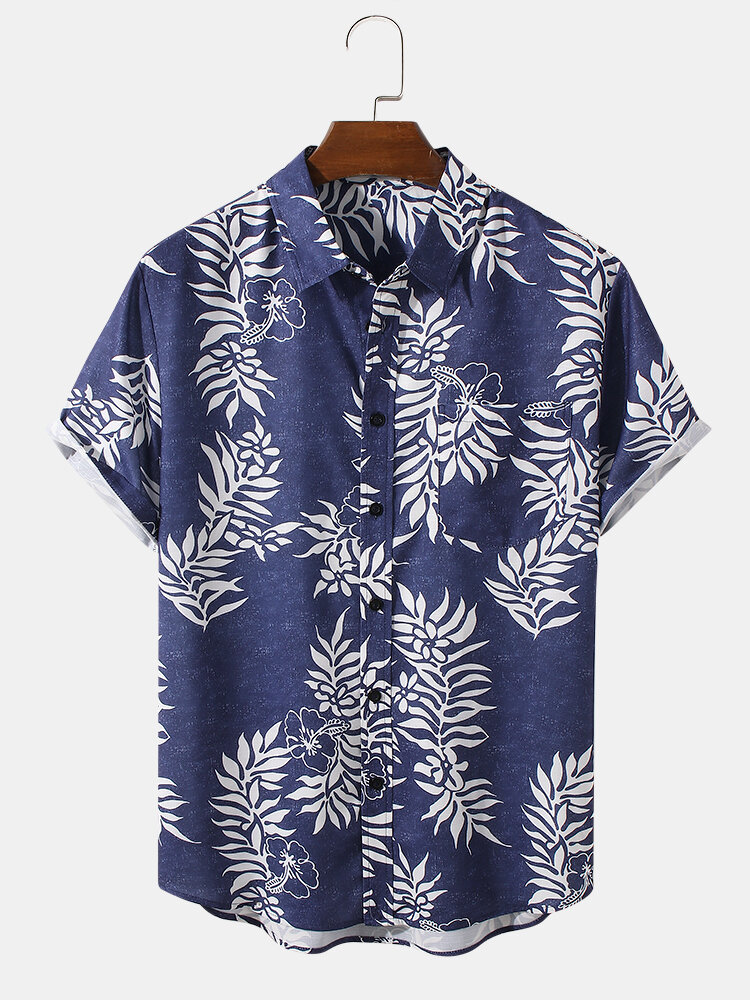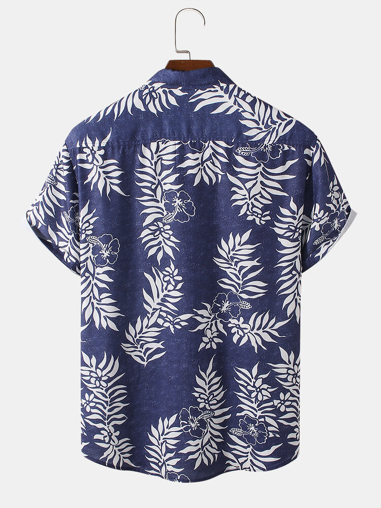Mens Holiday Plants Floral Print Casual Short Sleeve Shirt – Blue S