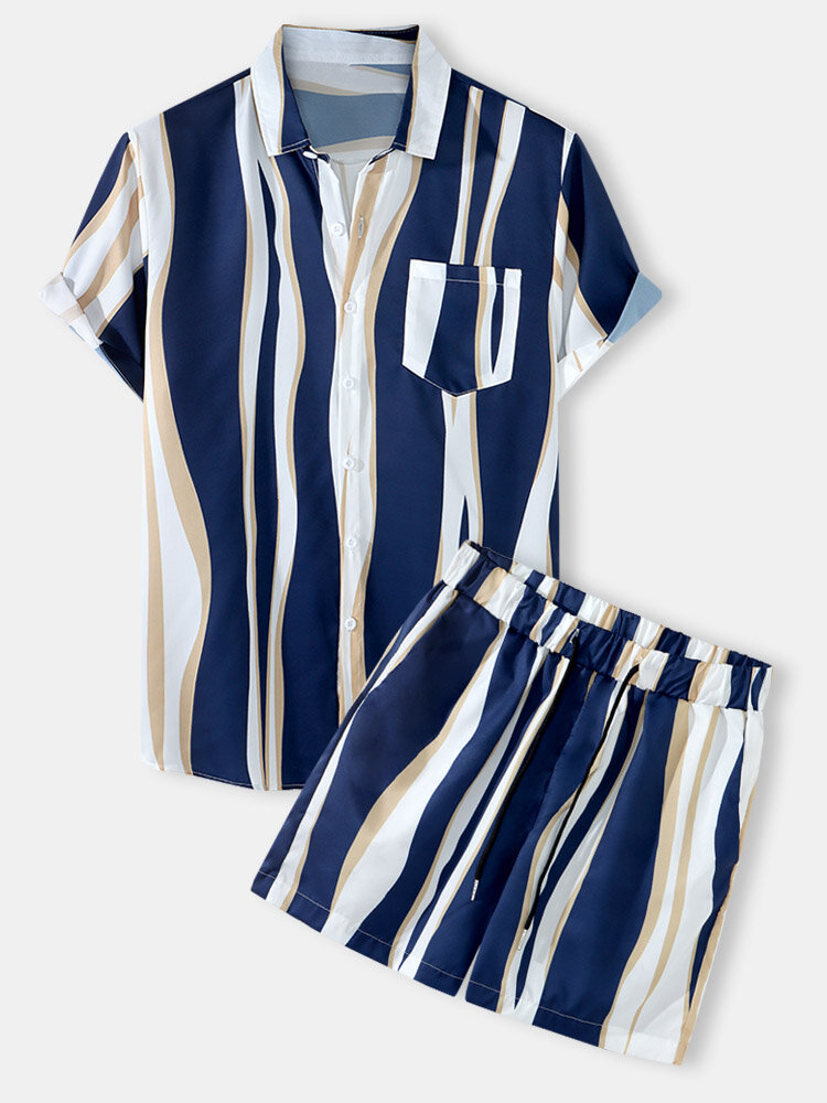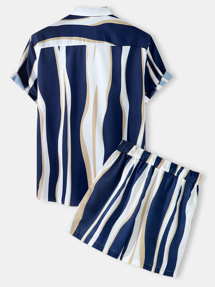 Mens Holiday Striped Two Pieces Outfits Lapel Short Sleeve Shirts Shorts – Blue M