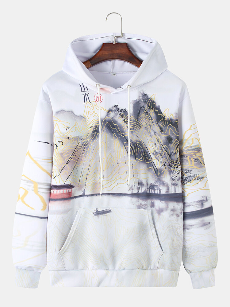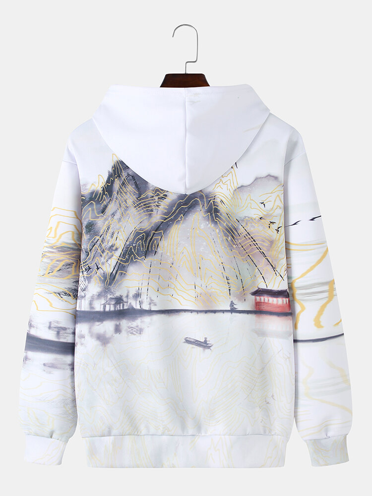 Mens Ink Painting Print Chinoiserie Long Sleeve Warm Hoodies – White S