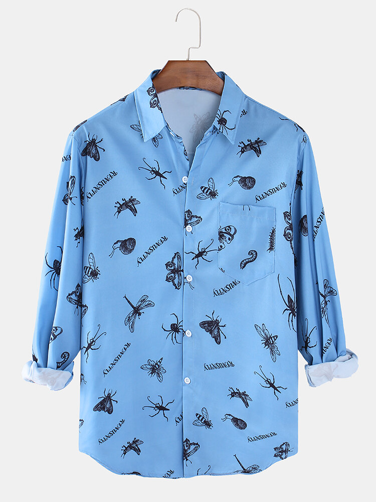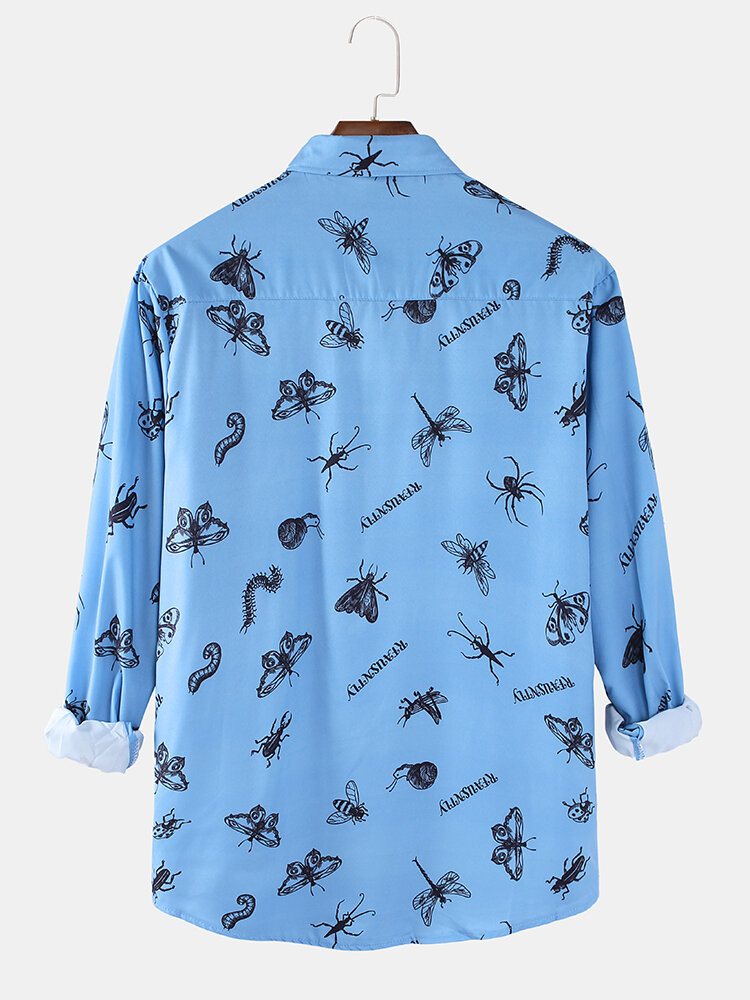 Mens Insect Print Chest Pocket Lapel Long Sleeve Casual Shirts – Black M