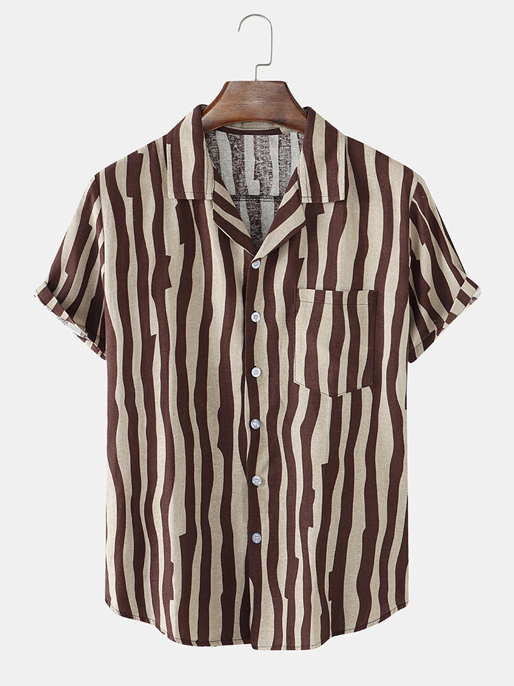 Decoration:Pocket,ButtonFit Type:Regular FitMaterial:CottonNeckline:Revere CollarPattern Type:StripedScene:Leisure,CasualSeason:Spring,SummerSize:XXL,L,S,XL,MSleeve:Short SleeveStyle:CasualThickness:Regular
