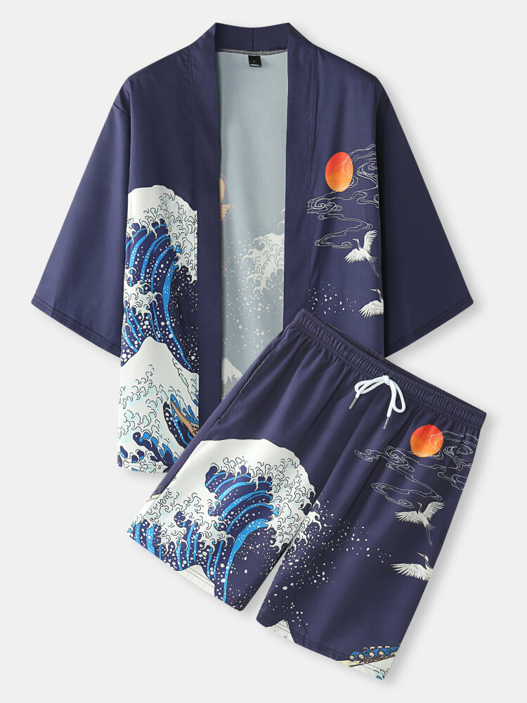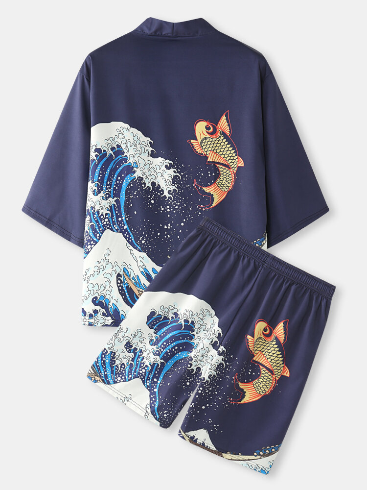 Mens Japanese Kimono Wave & Koi Ukiyoe Back Print Two Pieces Outfits – Navy S