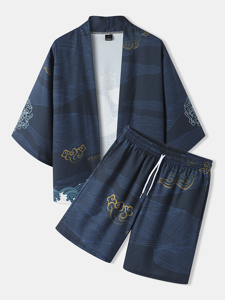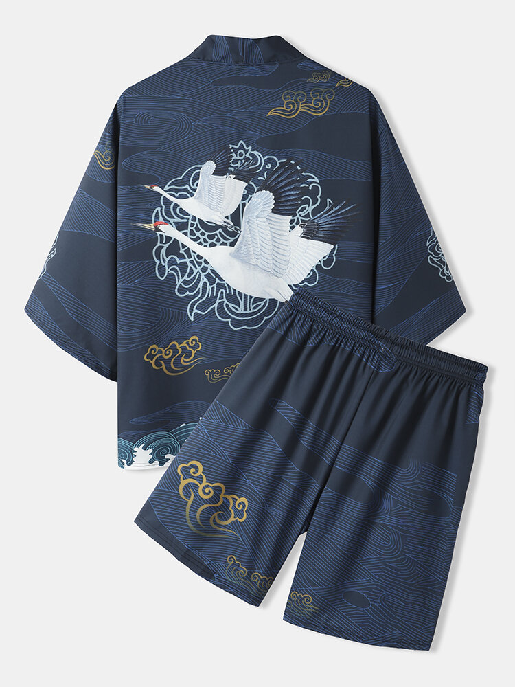 Mens Japanese Style Crane Back Pattern Open Front Kimono Two Pieces Outfits – Navy S