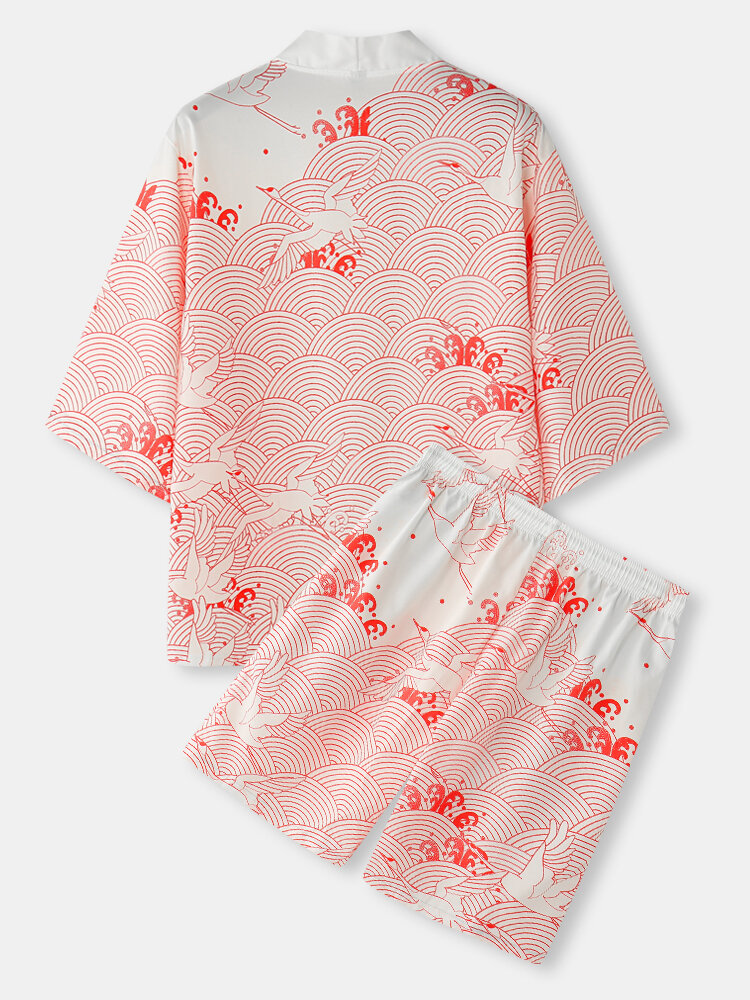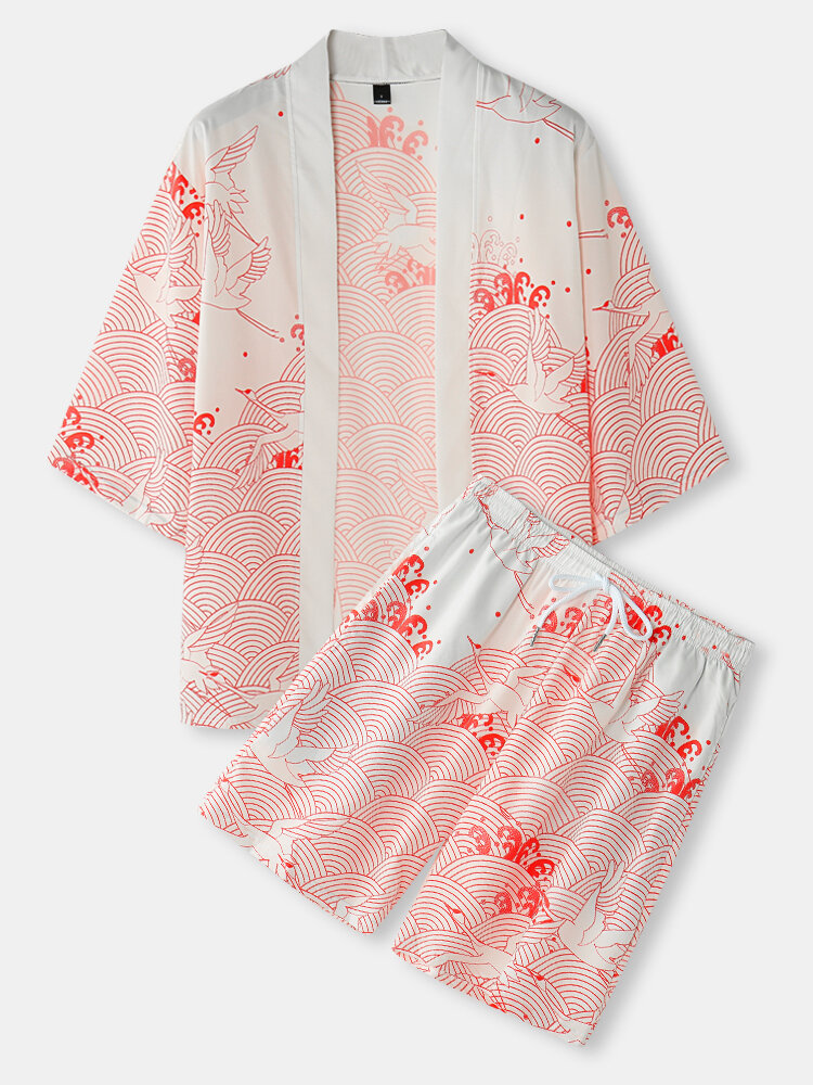 Mens Kimono Crane Propitious Clouds Pattern & Drawstring Two Pieces Outfits – Pink S