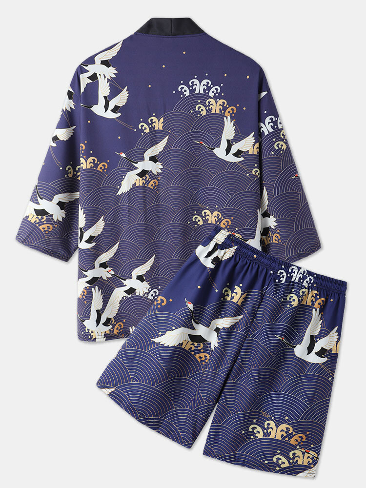 Mens Kimono Ethnic Style Crane Print Open Front Casual Two Pieces Outfits – Purple S