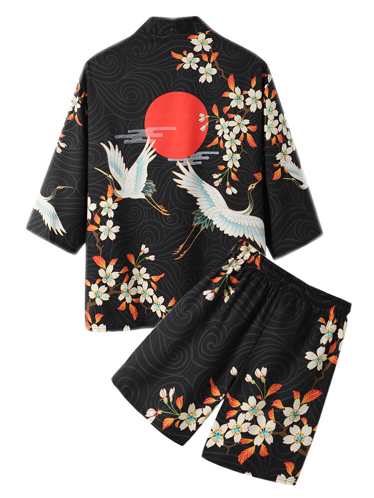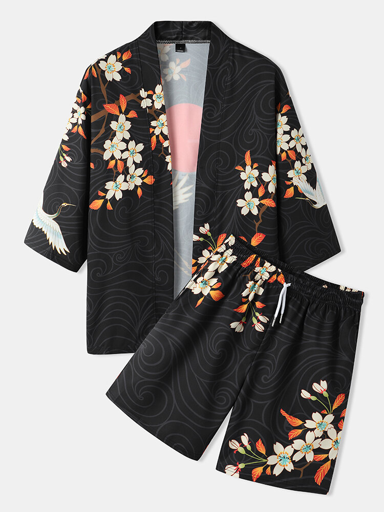 Mens Kimono Floral Crane Print Open Front Two Pieces Outfits – Black S