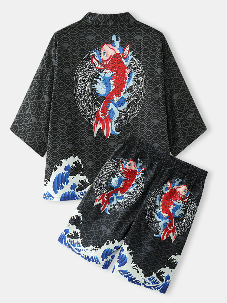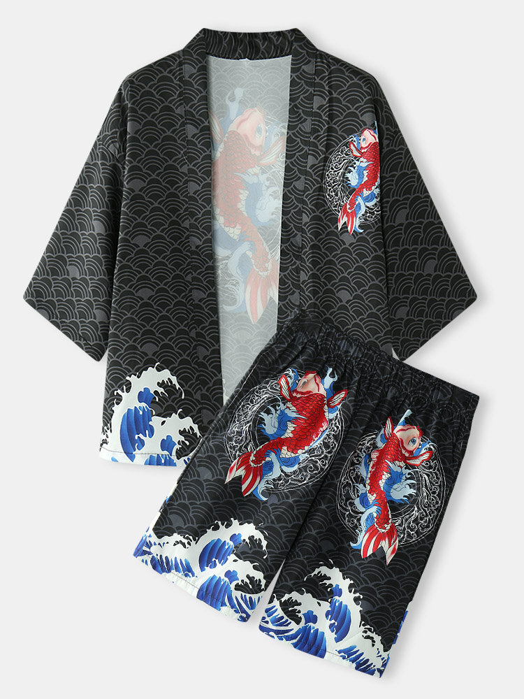 Mens Kimono Japanese Koi & Wave Print Open Front Two Pieces Outfits – Black S