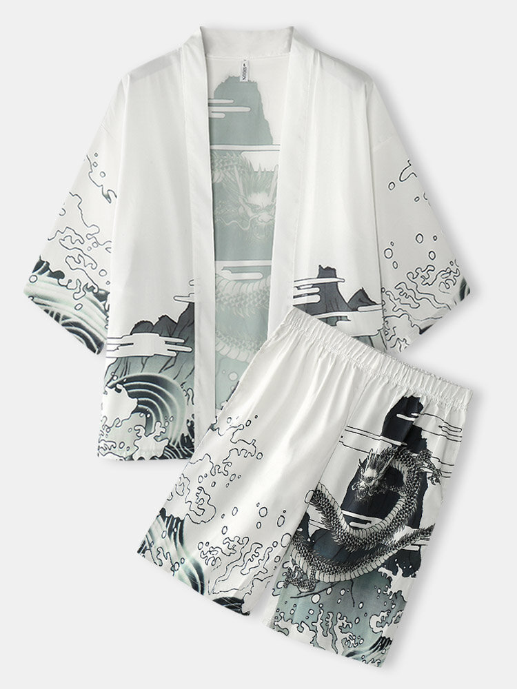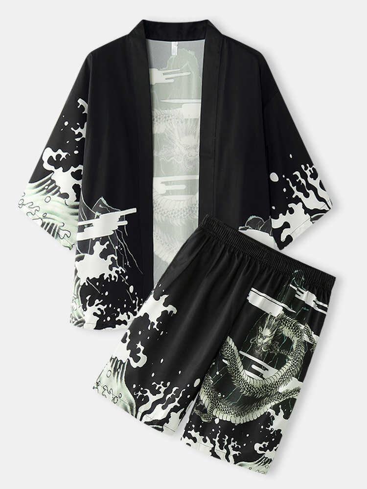 Mens Kimono Loong Pattern Chinoiserie Dragon Two Piece Outfits – Black S