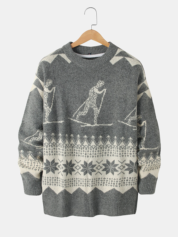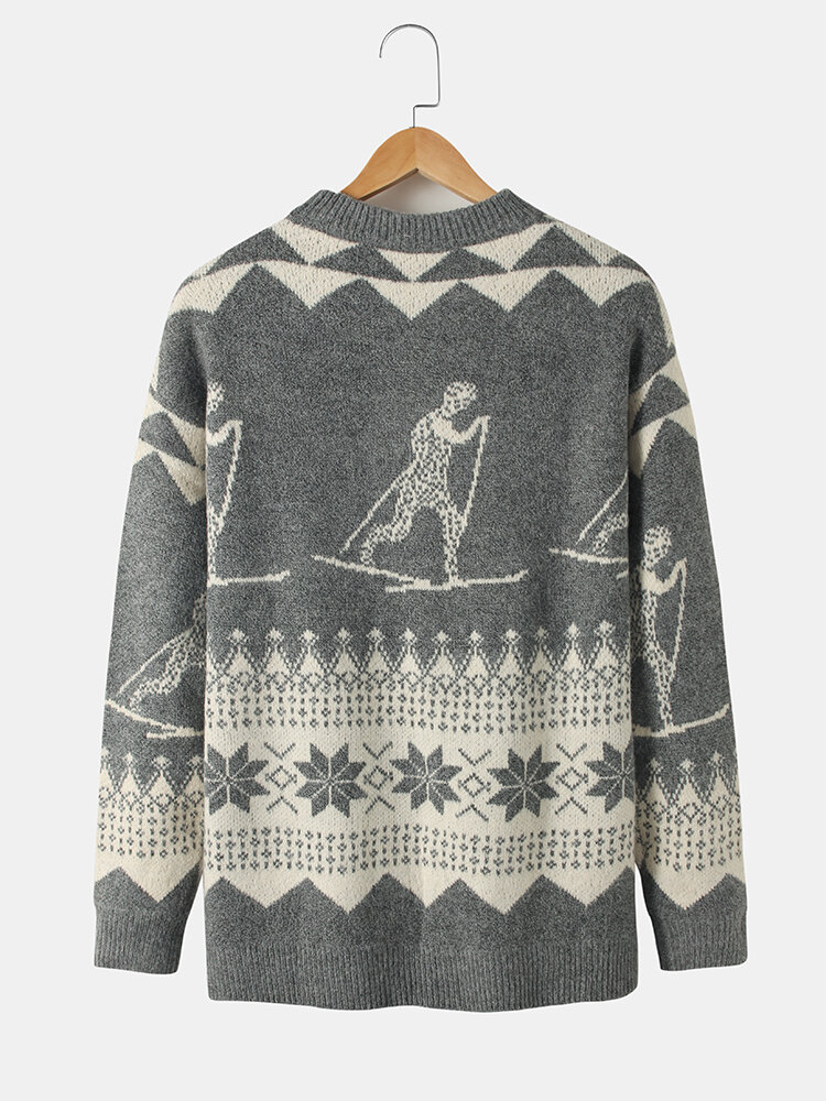 Mens Knitted Figure Geometry Pattern Warm Long Sleeve Pullover Sweaters – Grey XL