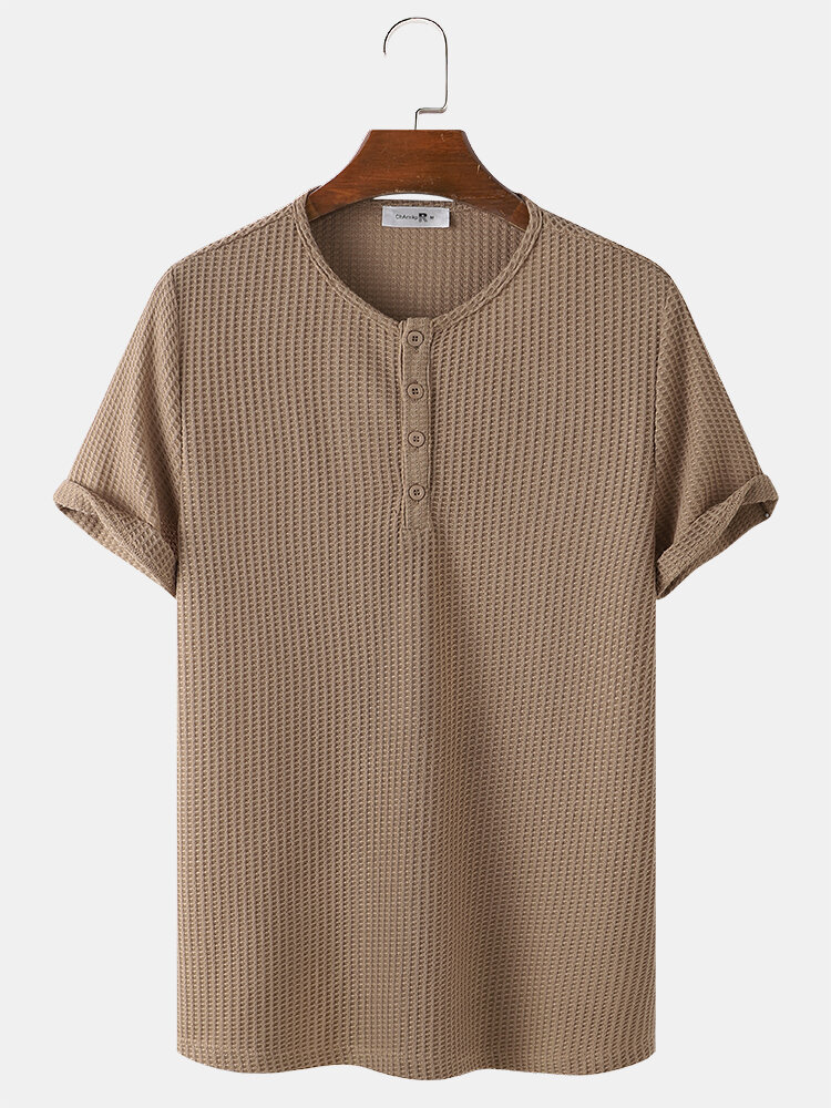 Mens Knitted Waffle Solid Color Short Sleeve Casual T-Shirt – Khaki 2XL