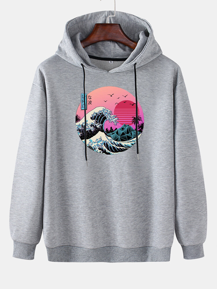 Mens Landscape Print Drop Shoulder Long Sleeve Drawstring Hoodies – Black S