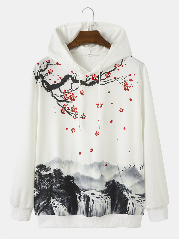 Mens Landscape Printed Drawstring Hoodies With Kangaroo Pocket – White M