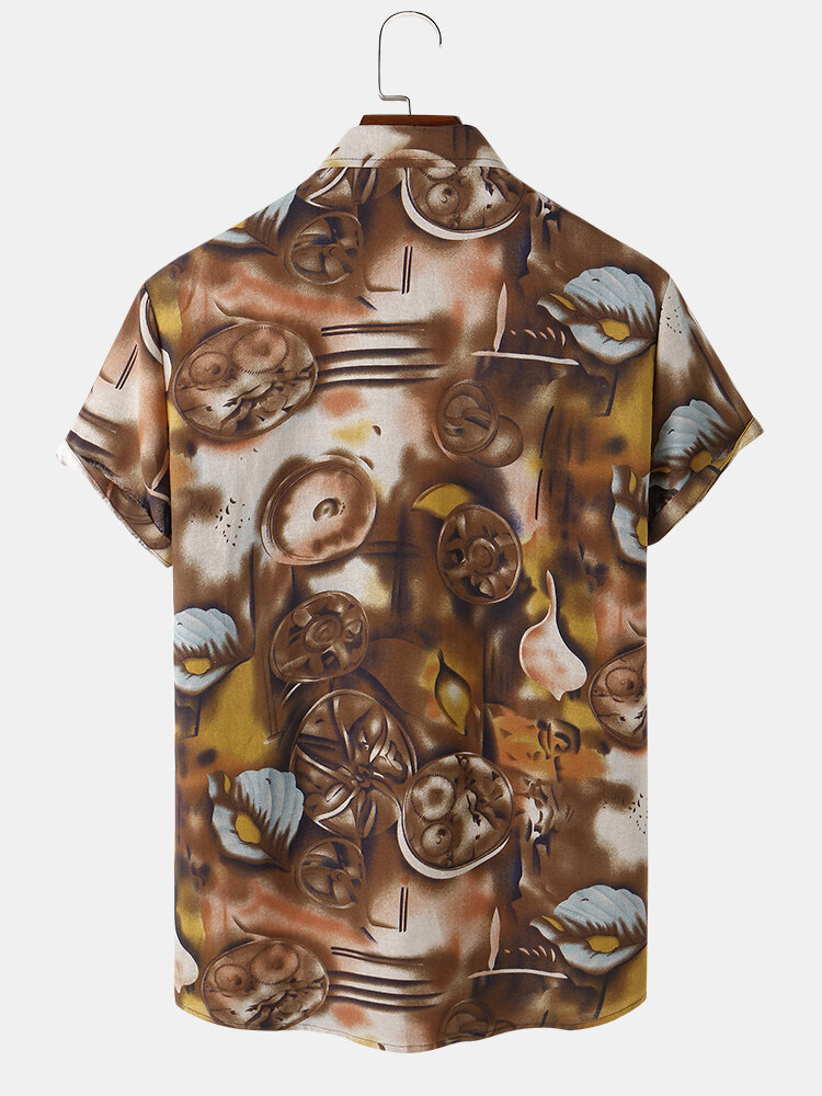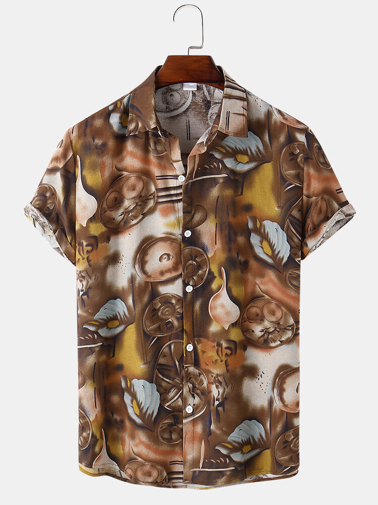 Mens Lapel Vintage Foral Print Short Sleeve Shirt – Coffee M