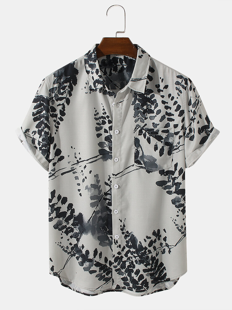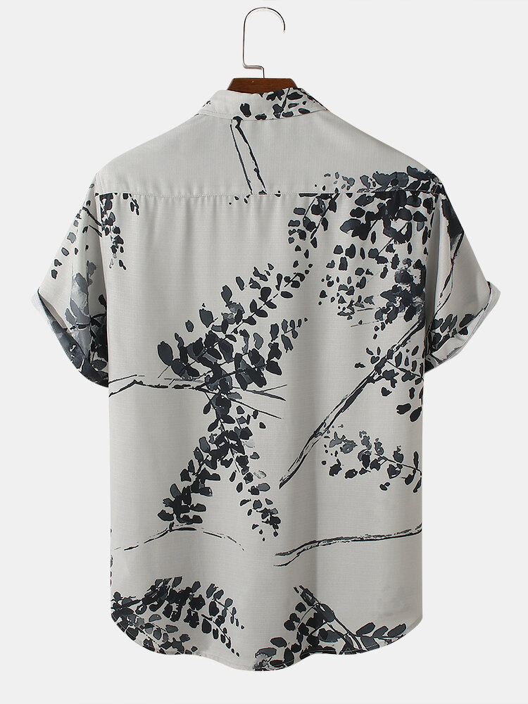 Mens Leaves Ink Painting Print Short Sleeve Casual Shirts – Beige S