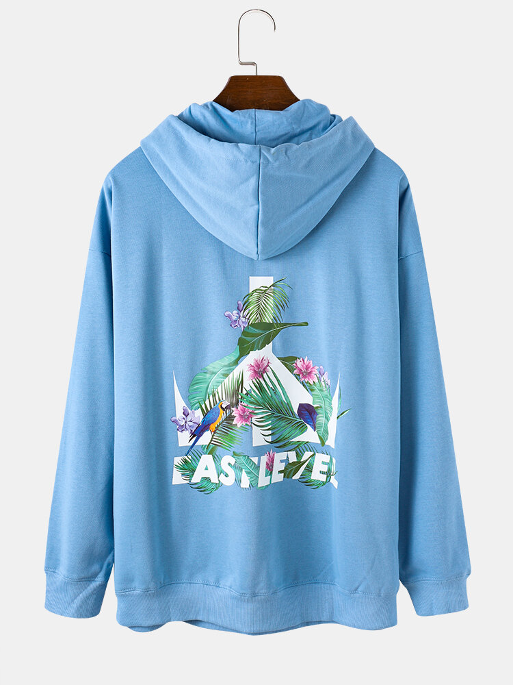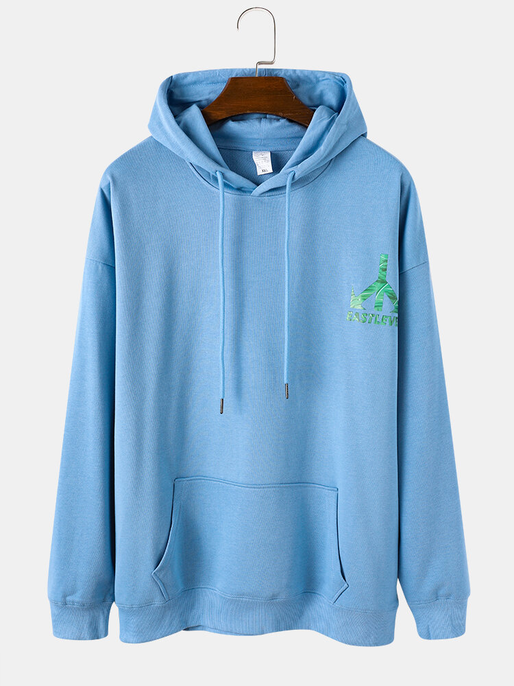 Mens Leaves Plant Letter Print Long Sleeve Drop Shoulder Blue Hoodies – White 2XL