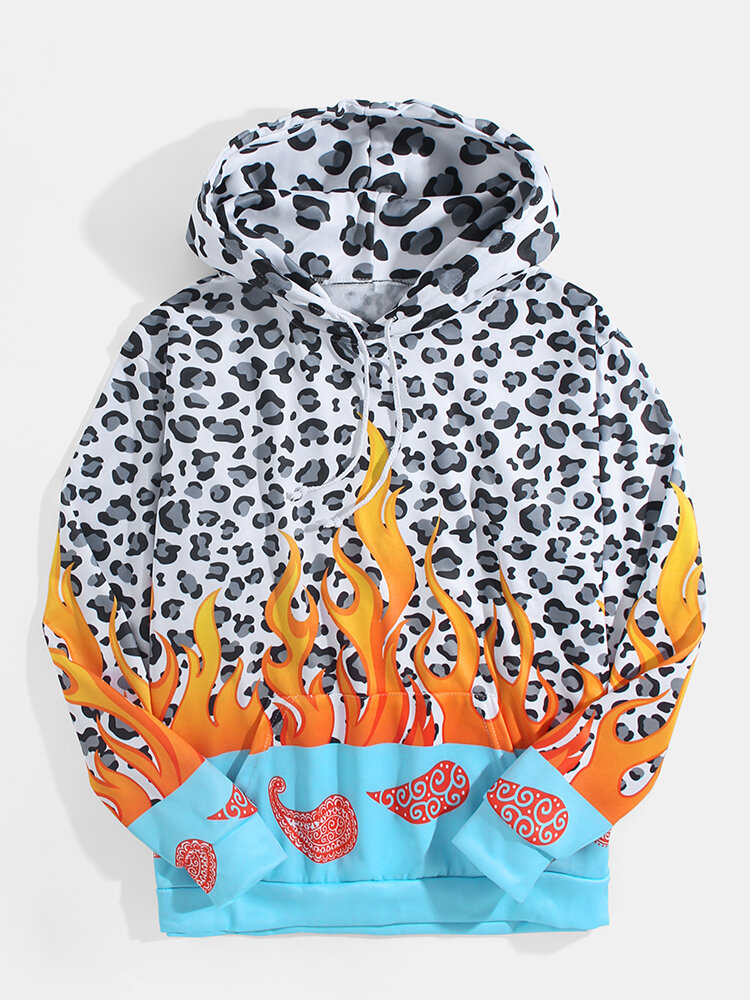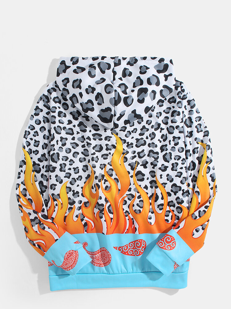 Mens Leopard Flame Print Kangaroo Pocket Design Drawstring Hoodies – L White