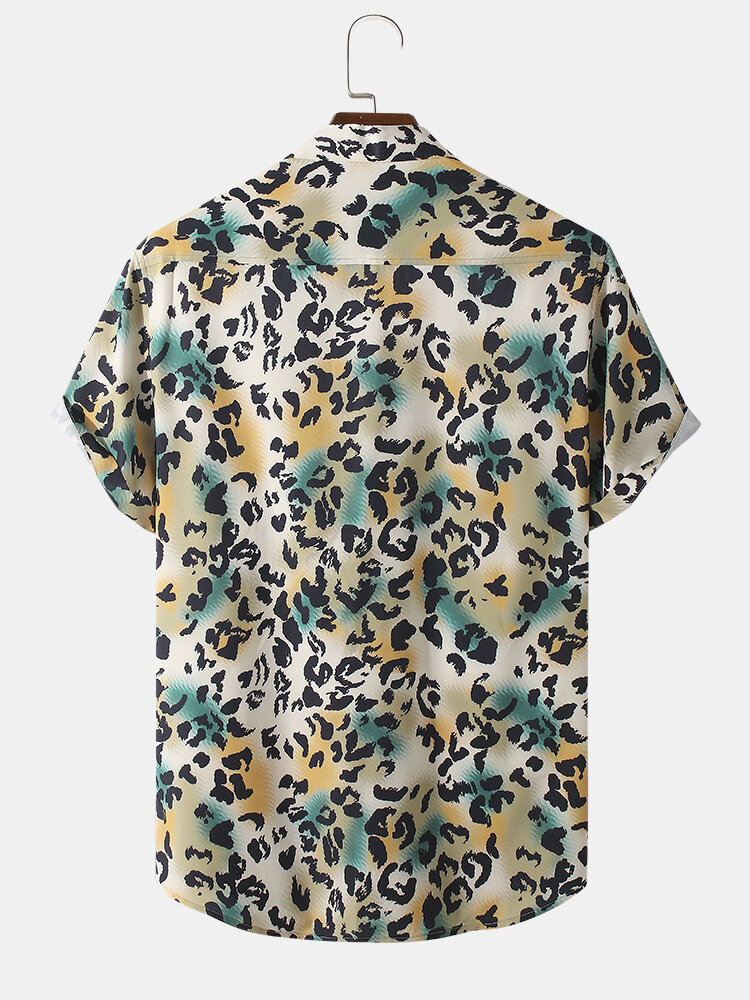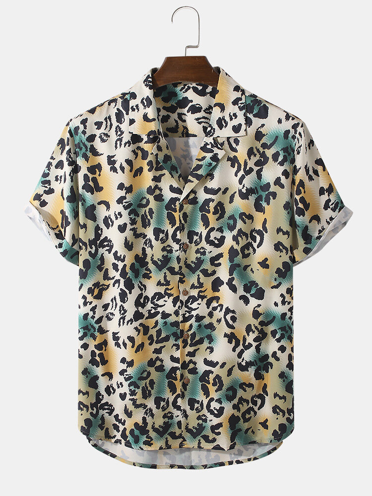 Mens Leopard Print Revere Collar Short Sleeve Shirt – Apricot S