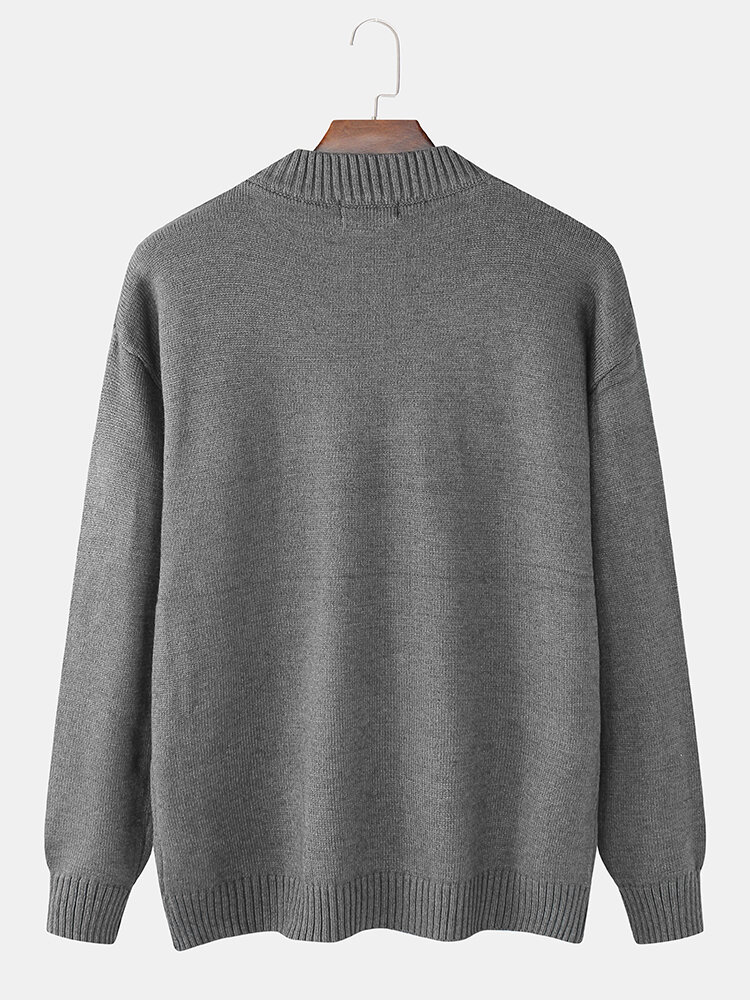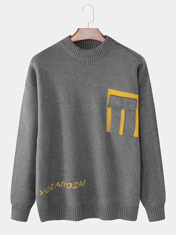Mens Letter Chest Pocket Colorblock Knitted Round Neck Casual Sweaters – M Navy