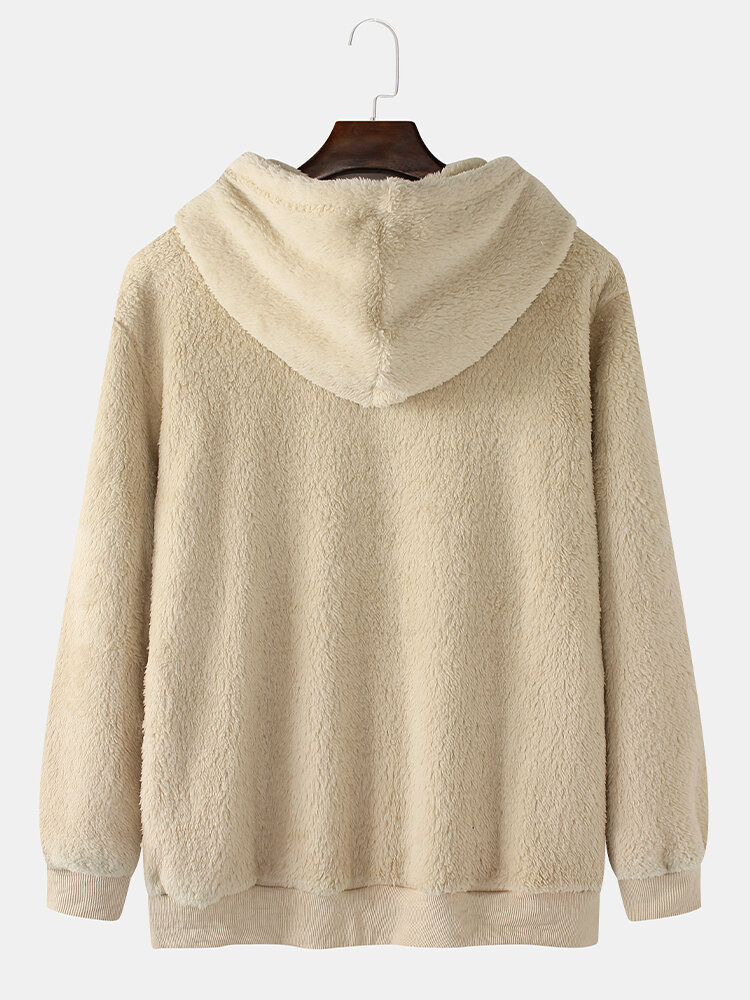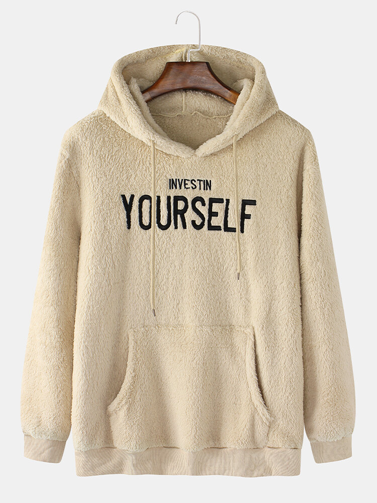 Mens Letter Embroidered Kangaroo Pocket Fluffy Long Sleeve Hoodies – Khaki 2XL