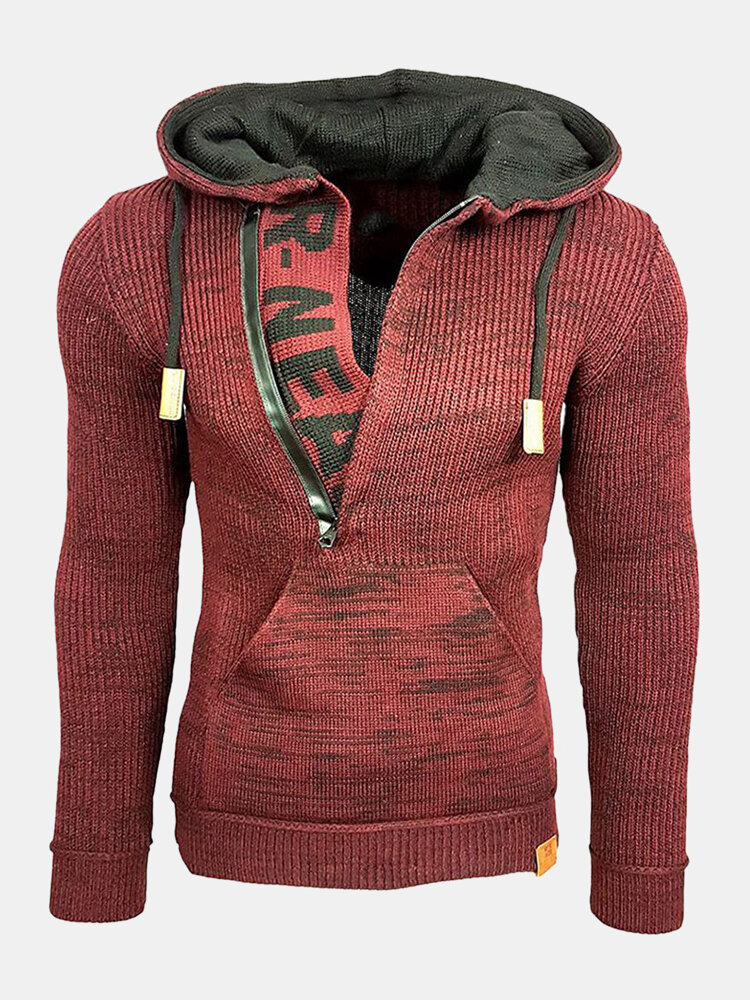 Mens Letter V-Neck Zip Knit Pullover Casual Drawstring Hooded Sweaters – Red L