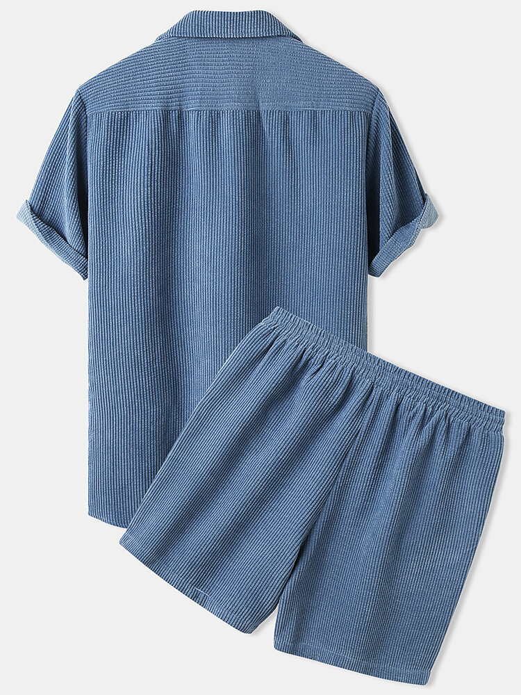 Mens Light Corduroy Solid Color Patch Pocket Elastic Waist Breathable Shirt & Shorts – Blue S