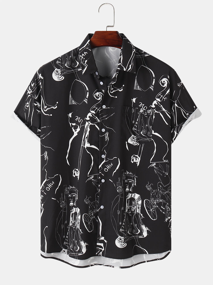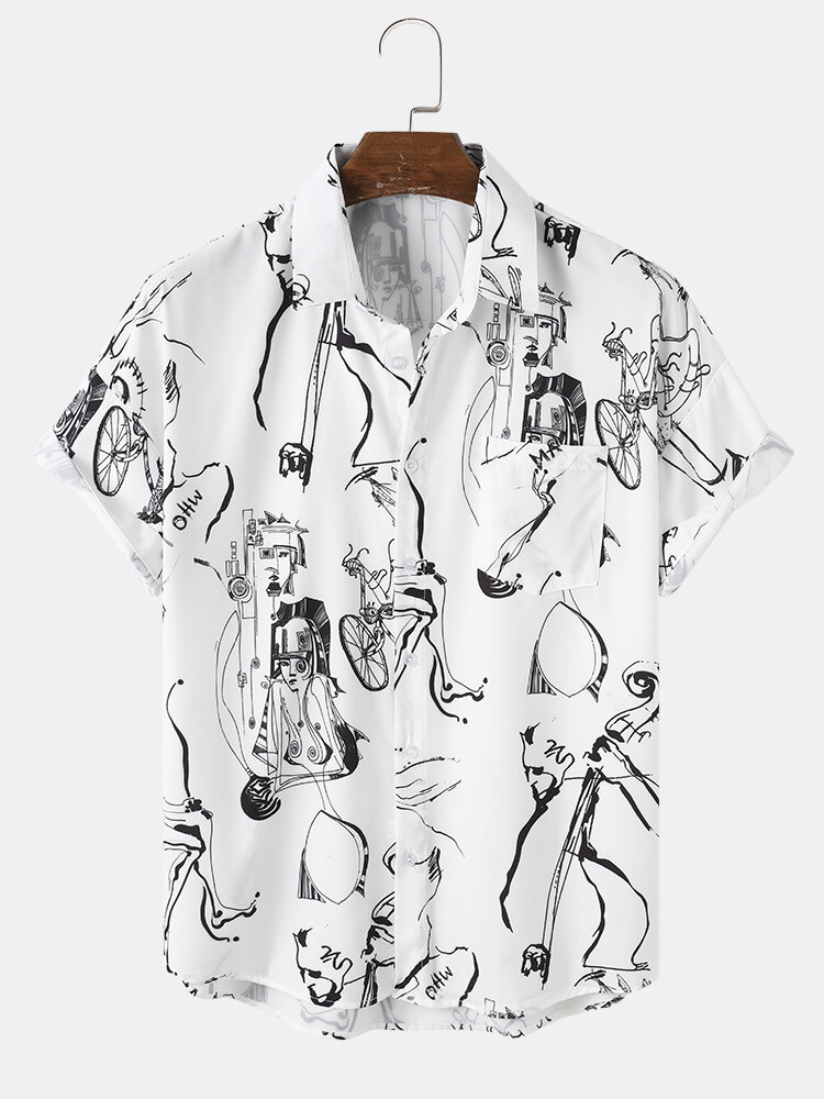 Mens Line Graffiti Print Lapel Short Sleeve Shirt – White XL