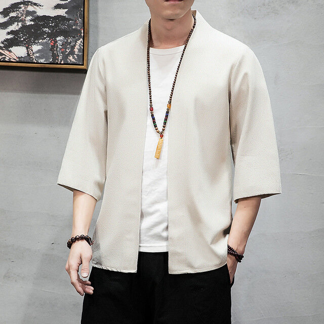 Men’s Linen New Chinese Style Retro Casual Wear Solid Color Collar Five-point Sleeve Cardigan Hanfu Jacket – 4XL Hemp color