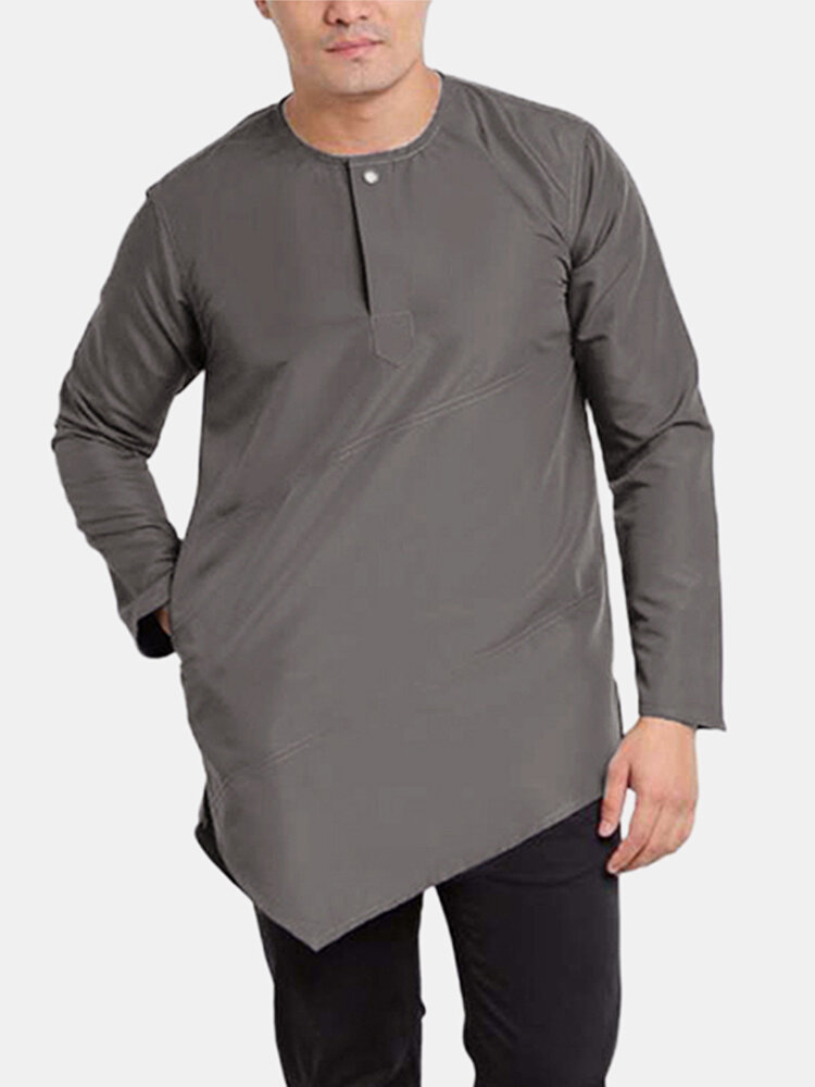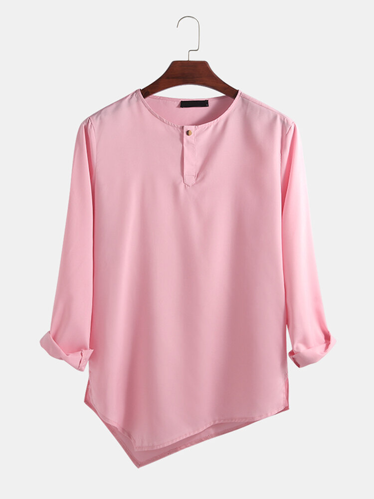 Men’s Long Sleeve Casual Shirt Button Neck Loose Irregular Hem Tops Oversize Tee – L Pink