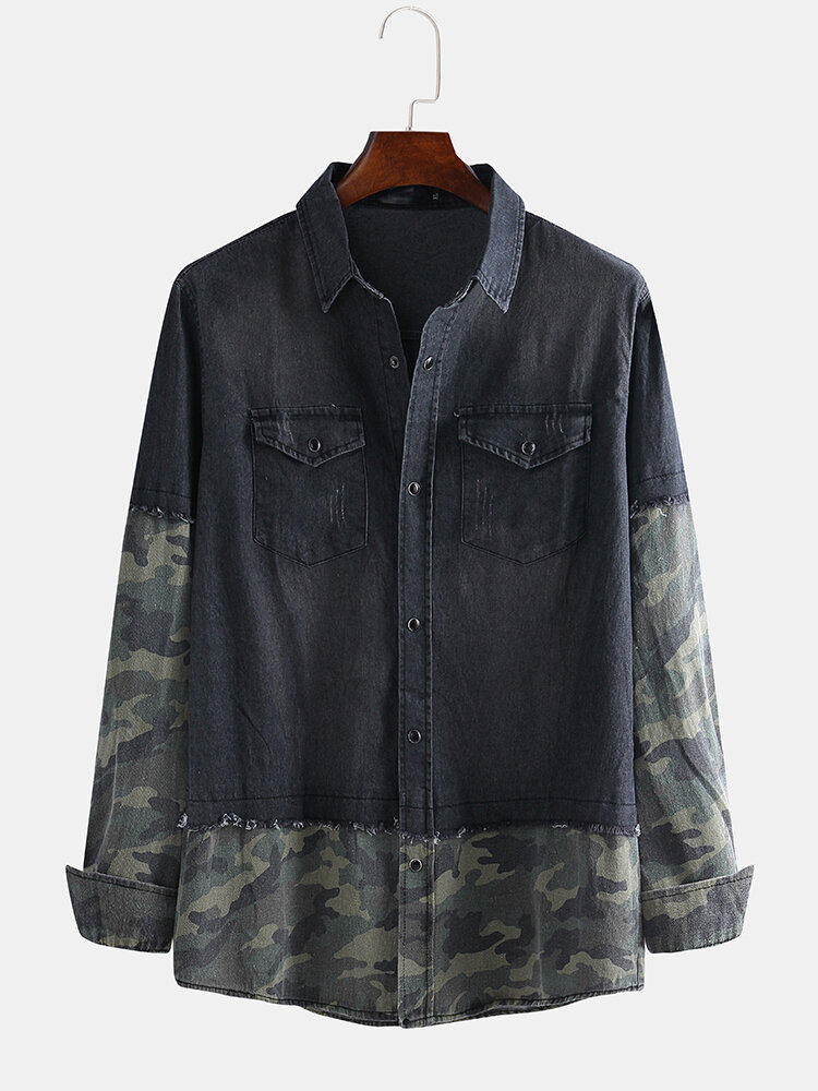 Men’s Long-sleeved Camouflage Stitching Personality Trend Double Pocket Denim Shirts – S Black