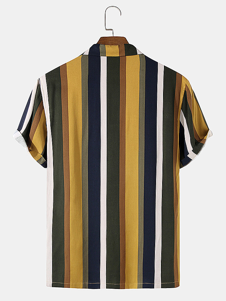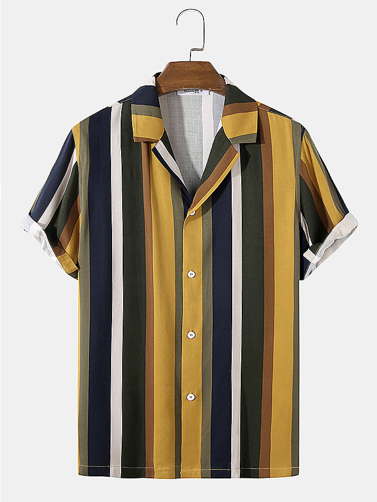 Mens Multicolor Striped Revere Collar Short Sleeve Daily Shirt – Green S