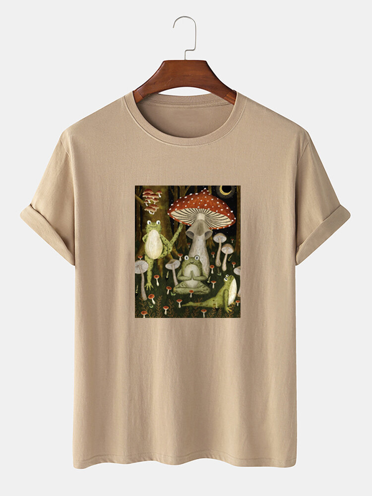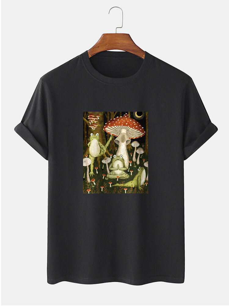 Mens Mushroom & Frog Graphic 100% Cotton Community Spirit Short Sleeve T-Shirts – Black XL