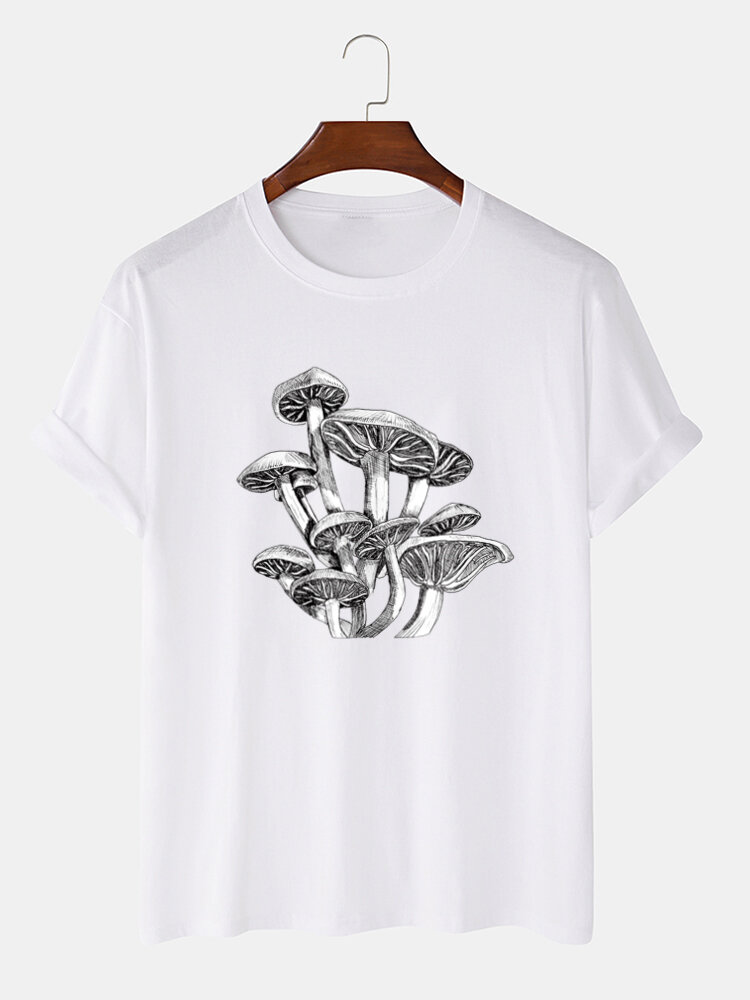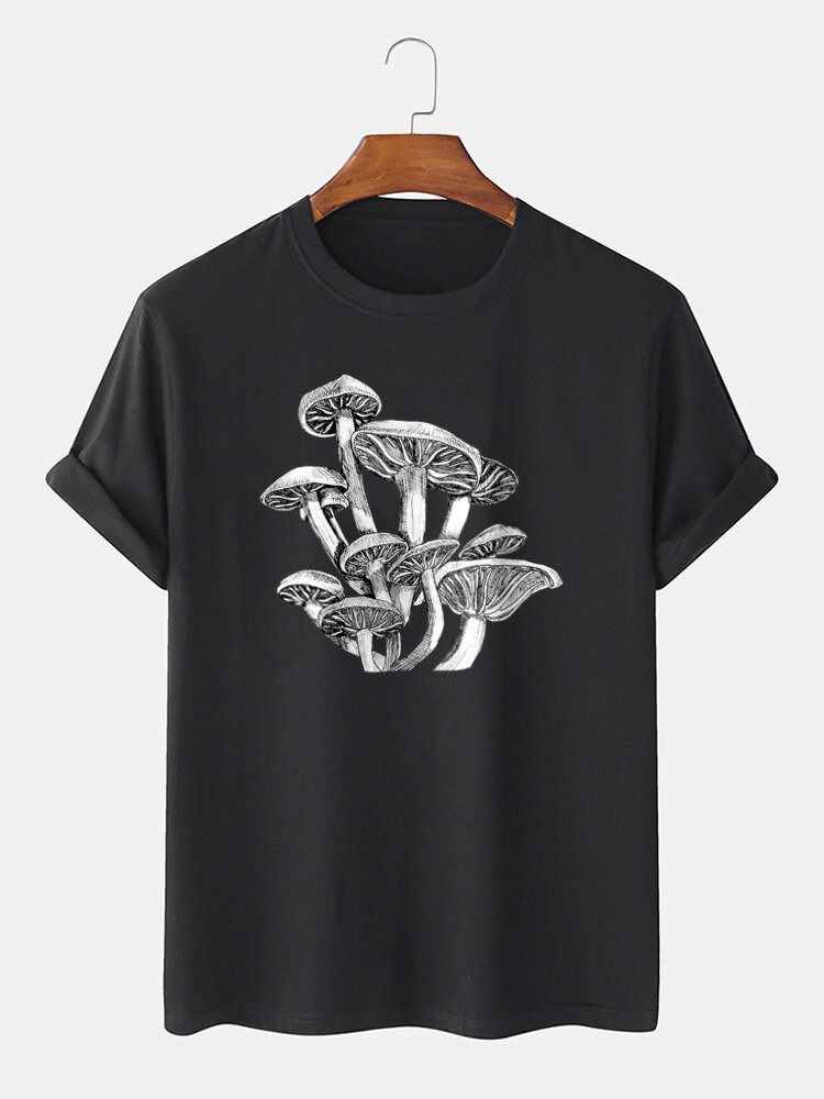 Mens Mushroom Sketches Print 100% Cotton O-Neck Short Sleeve T-Shirt – Black S
