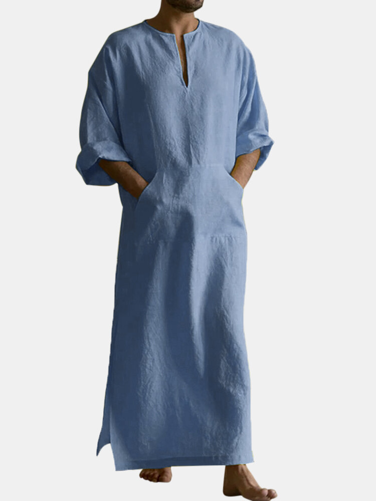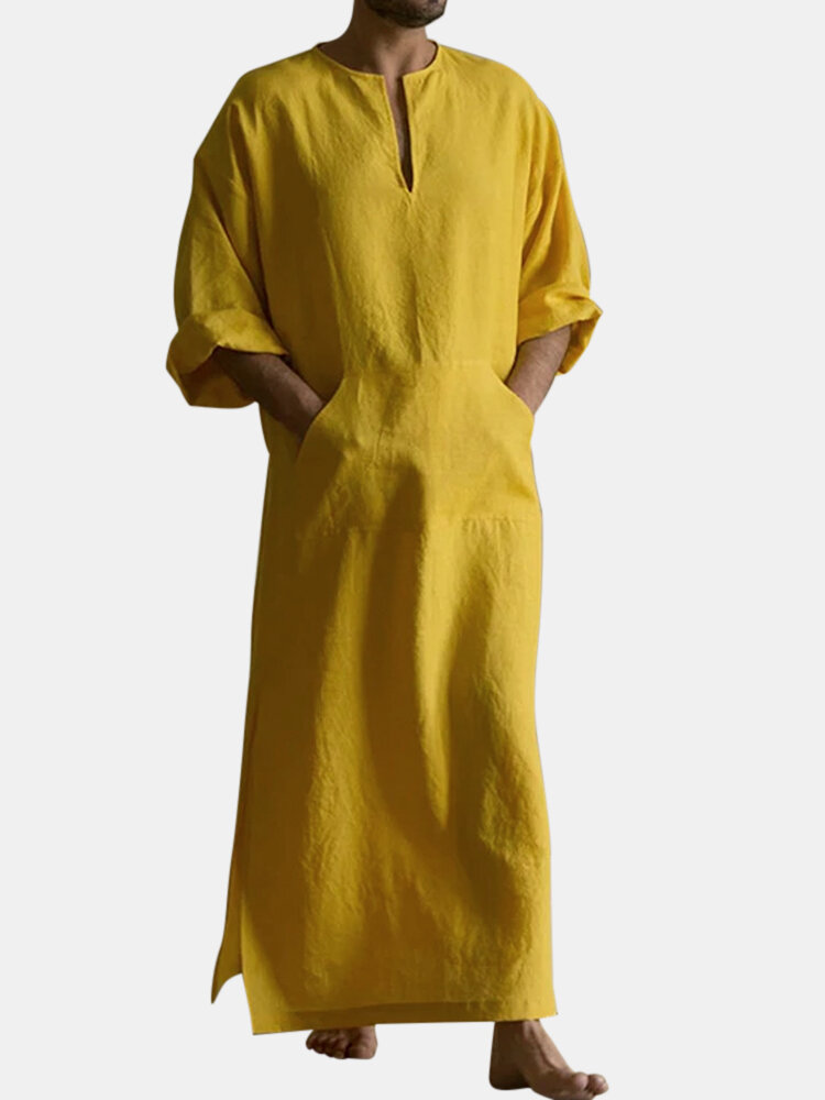 Mens Mustard Set Cotton Crew Neck Neckline Slit 3/4 Length Sleeve Long Length Gown Shirts – Yellow M