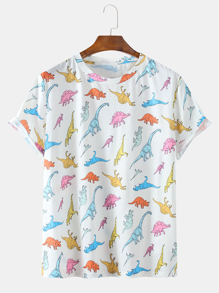 Mens New Fashion Dinosaur Print Crew Neck Short Sleeve T-Shirts – White XL