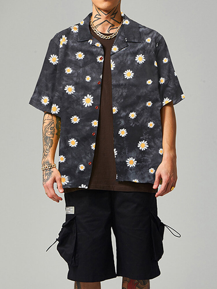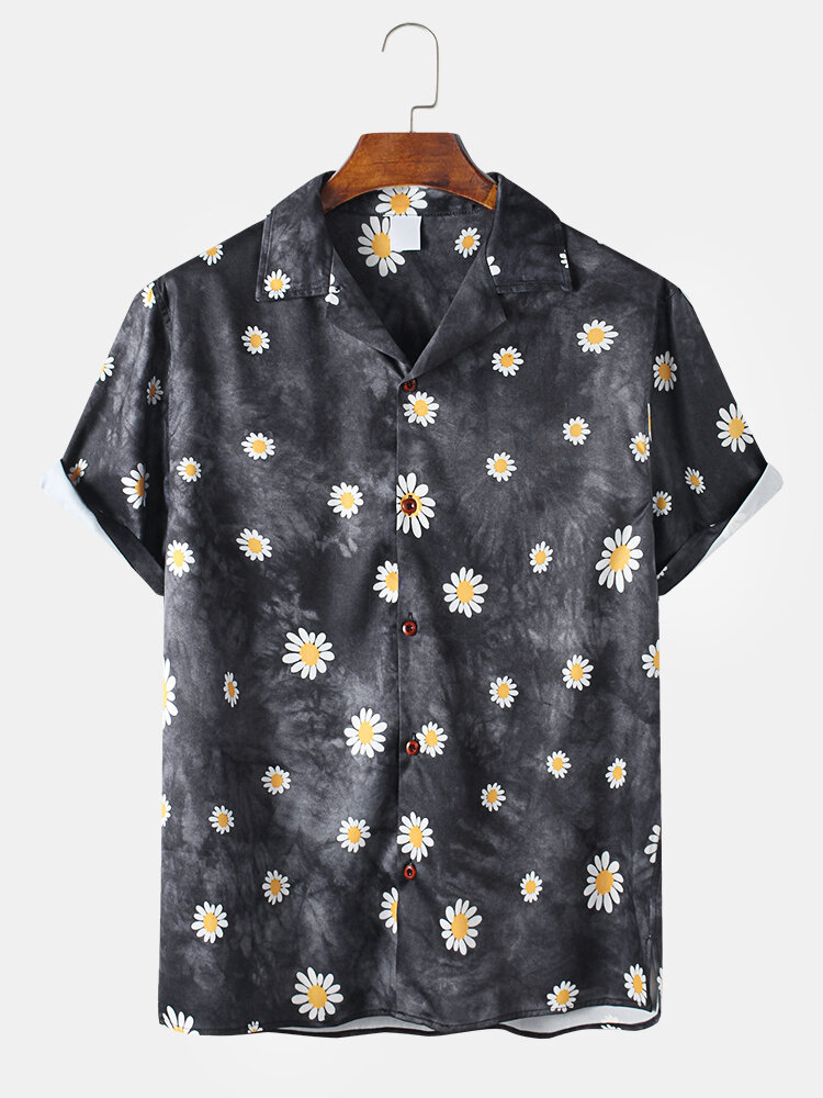 Mens New Fashion Flower Print Turn Down Collar Short Sleeve Shirts – Black L
