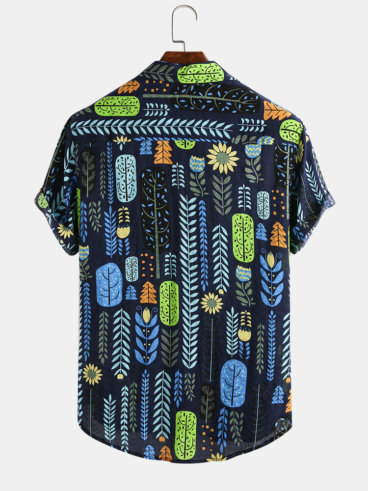 Mens New Leaf Cartoon Print Turn Down Collar Short Sleeve Shirts – Blue 3XL