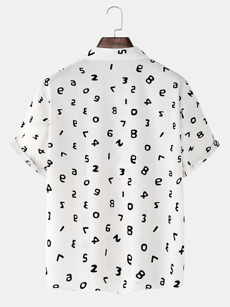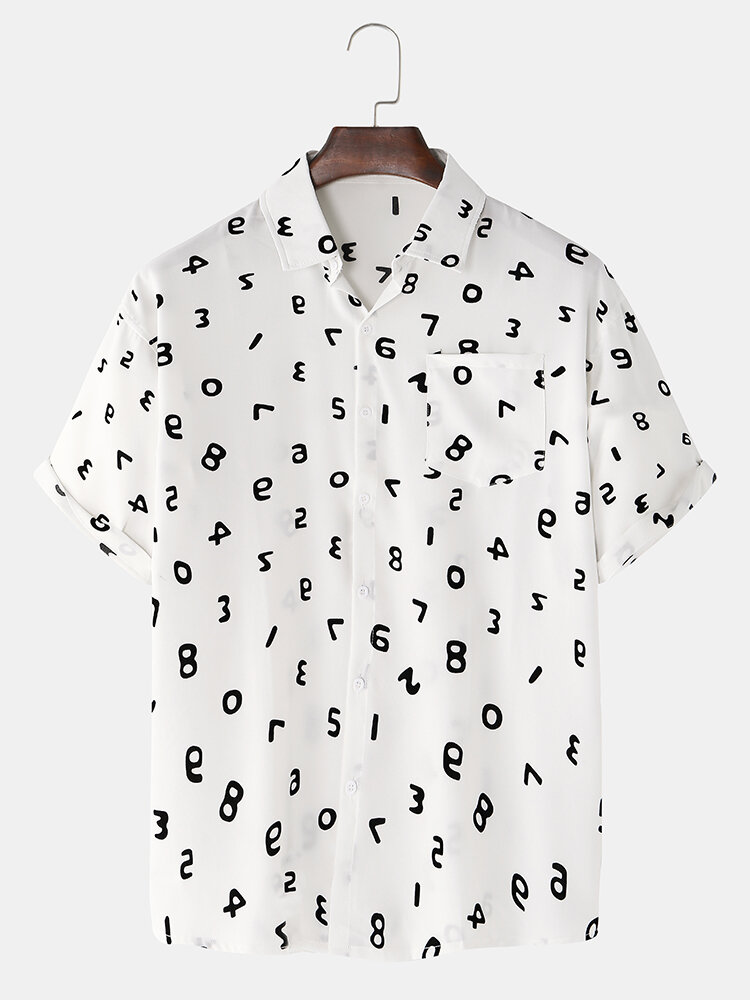 Mens Number Printt Casual Chest Pocket Lapel Collar Short Sleeve Shirts – White S