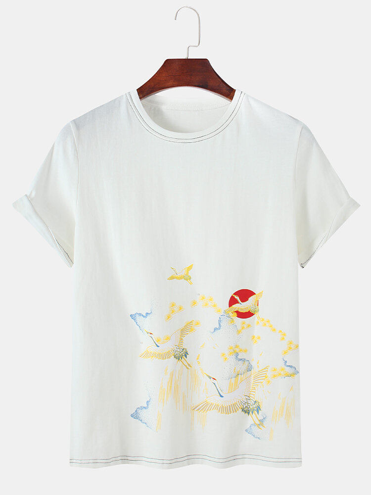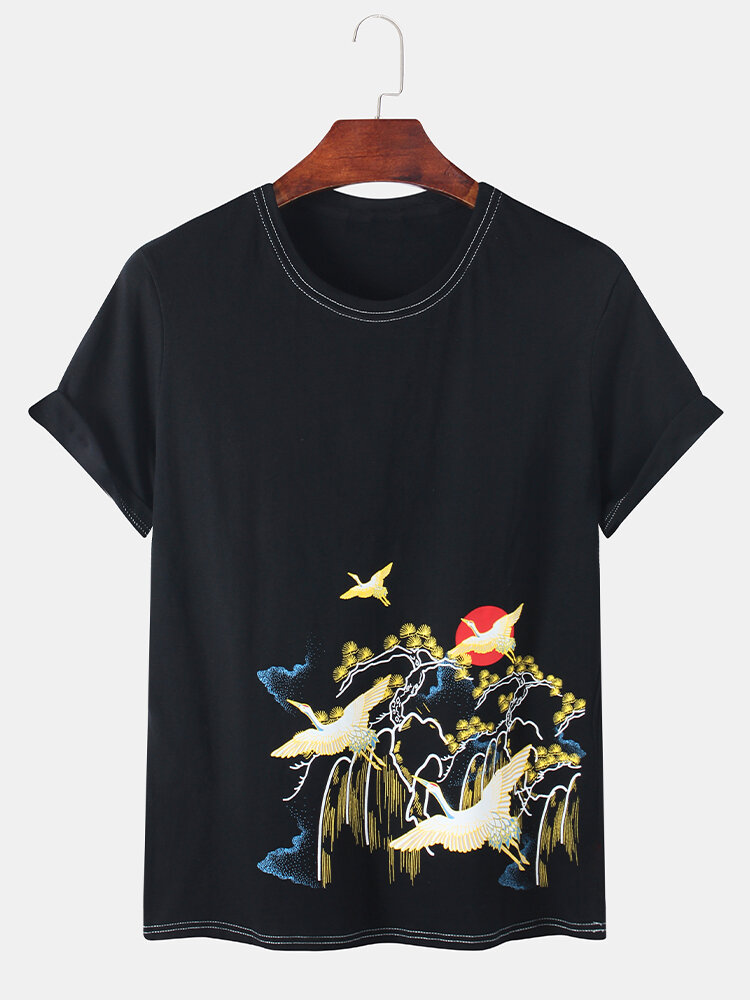 Mens Oriental Crane Flying Embroidery Crew Neck Short Sleeve Casual T-Shirts – White L