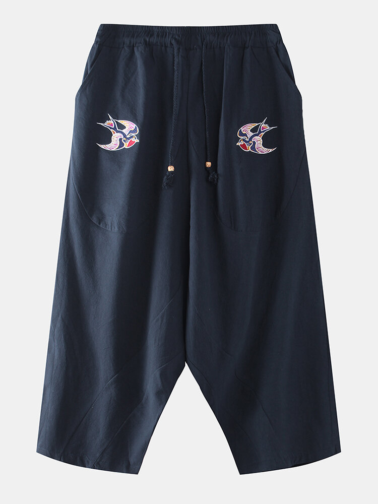 Mens Oriental Swallow Embroidery Casual Drop-Crotch Pants – Blue M